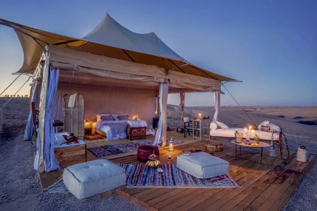 You’ll stay in a luxury desert camp with private ensuite tents, real beds, hot showers, and traditional Berber entertainment.